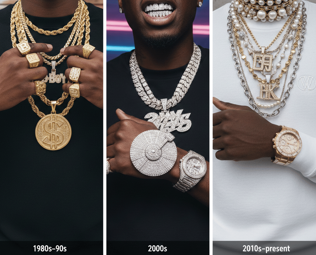 In the early decades of hip-hop, jewellery was bold, unmistakable, and symbolic. Thick gold chains, rope chains, oversized rings, and medallions dominated the scene. These pieces were not subtle by design. They represented success, authority, and visibility in environments where such recognition was often denied. Gold, in particular, became a visual language of achievement and respect.